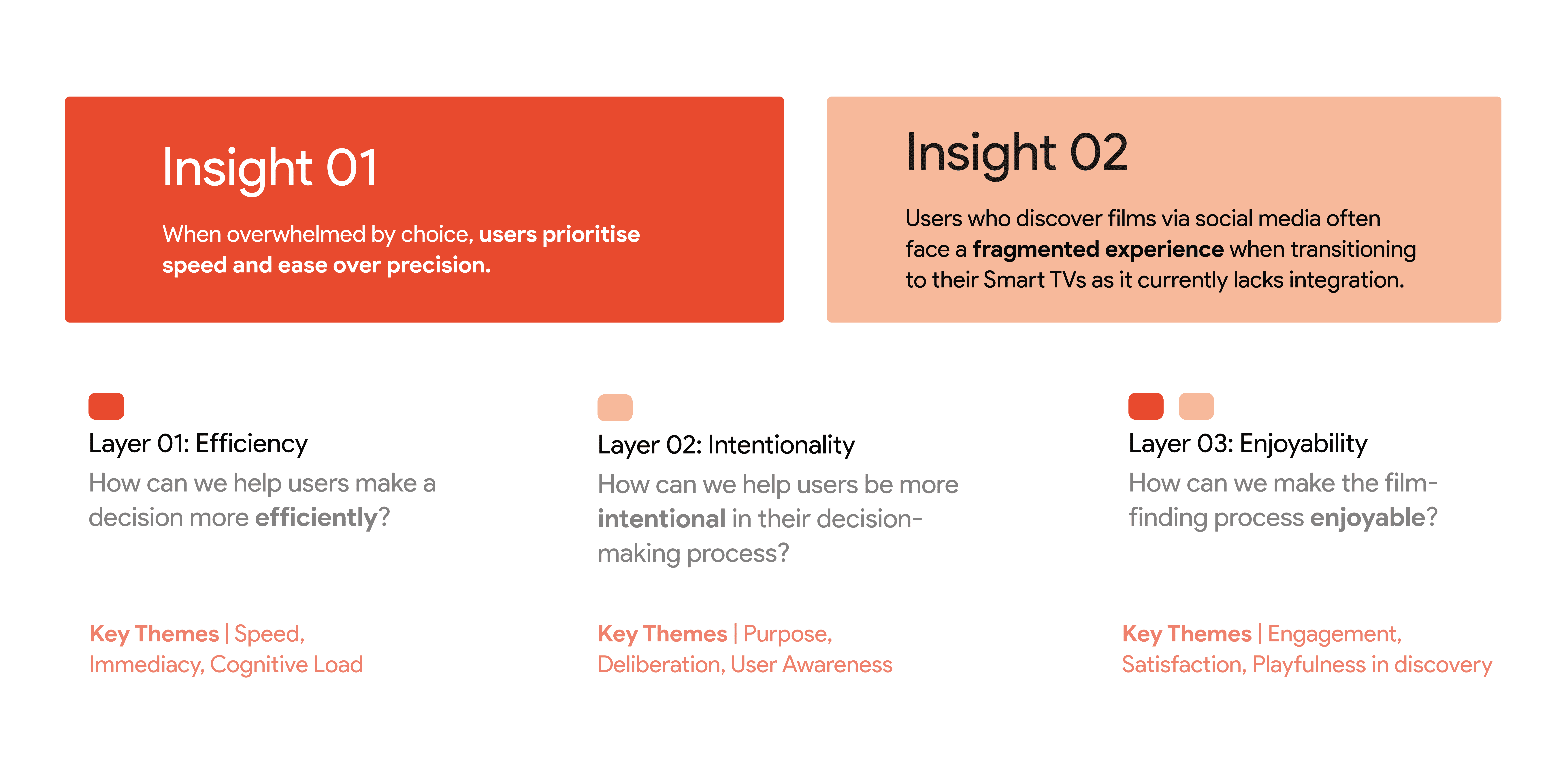 Our research highlighted challenges around overload, fragmented experiences, and surface-level decision-making, leading to a focus on efficiency, intentionality, and enjoyability