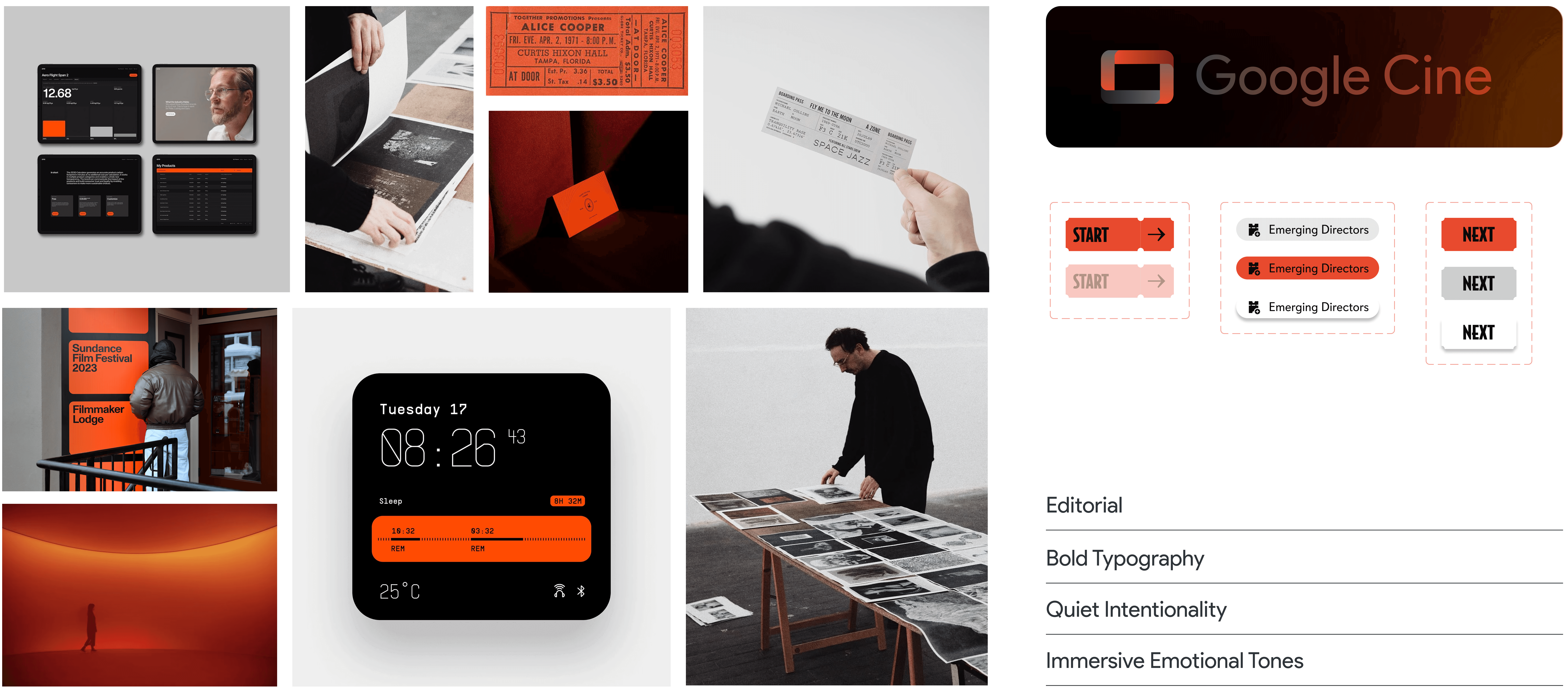 The design system was shaped by a visual direction inspired by cinematic culture, positioning Google Cine as a curated experience for film enthusiasts. It incorporates a defined colour palette, semantic cues, and thematic elements, such as cinema ticket references, to create a cohesive and recognizable identity across the interface.