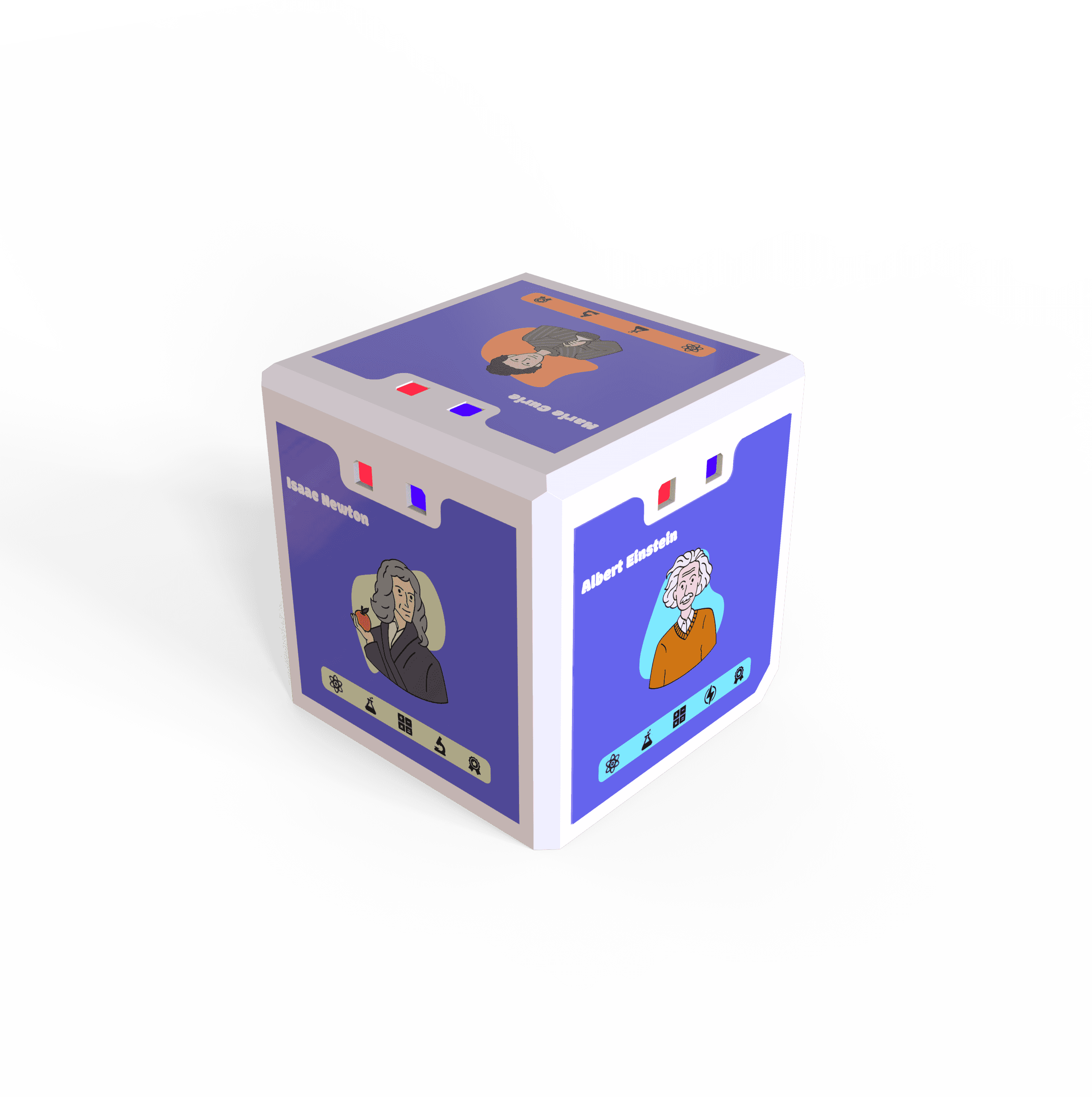 Guess & Roll is a hybrid educational game designed to introduce children to famous scientists through interactive play. The game combines a physical cube featuring different scientists and their attributes with a digital interface that supports the gameplay.