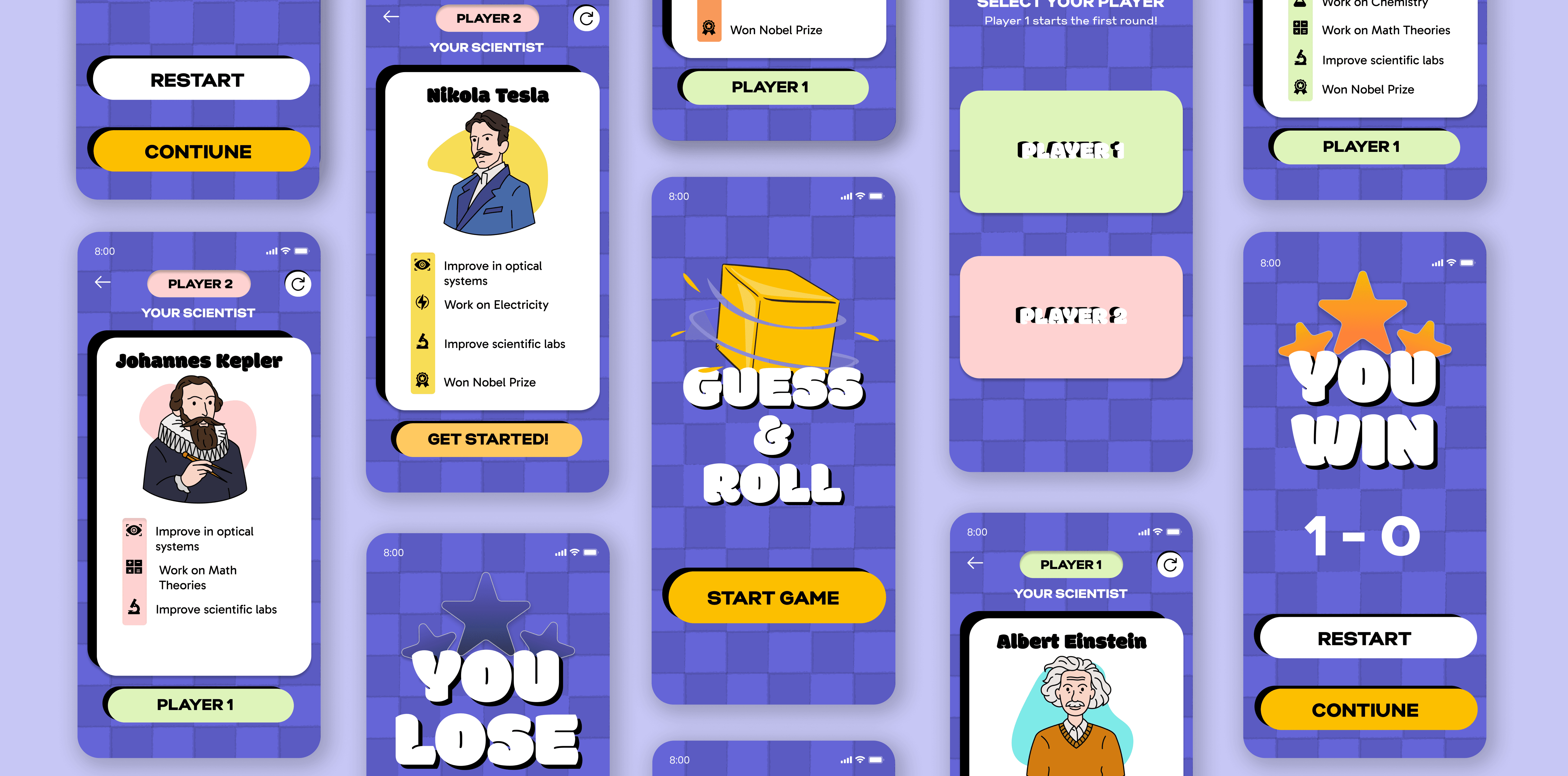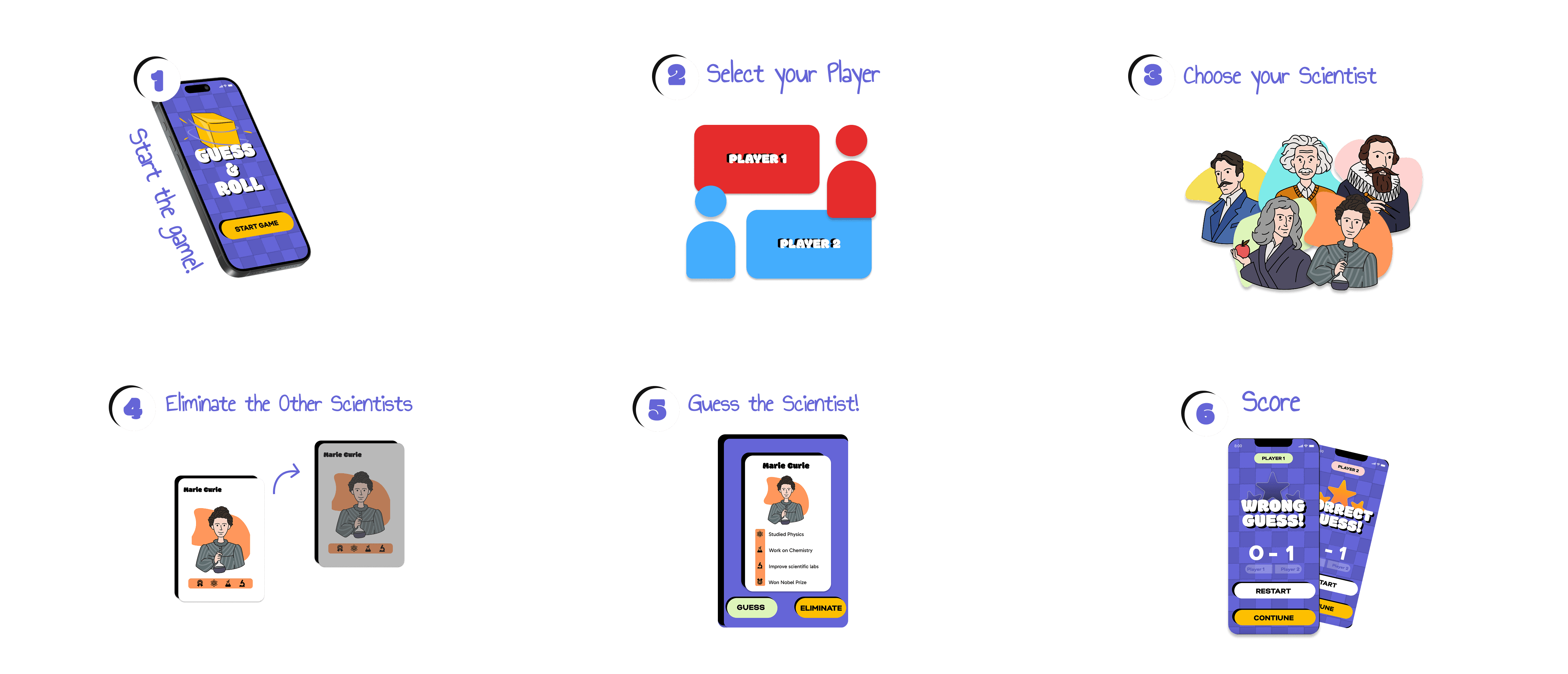 Five scientists were selected for the game, each defined by a set of distinctive characteristics. These attributes are used during gameplay to guide the questioning process and support the elimination of possible options.