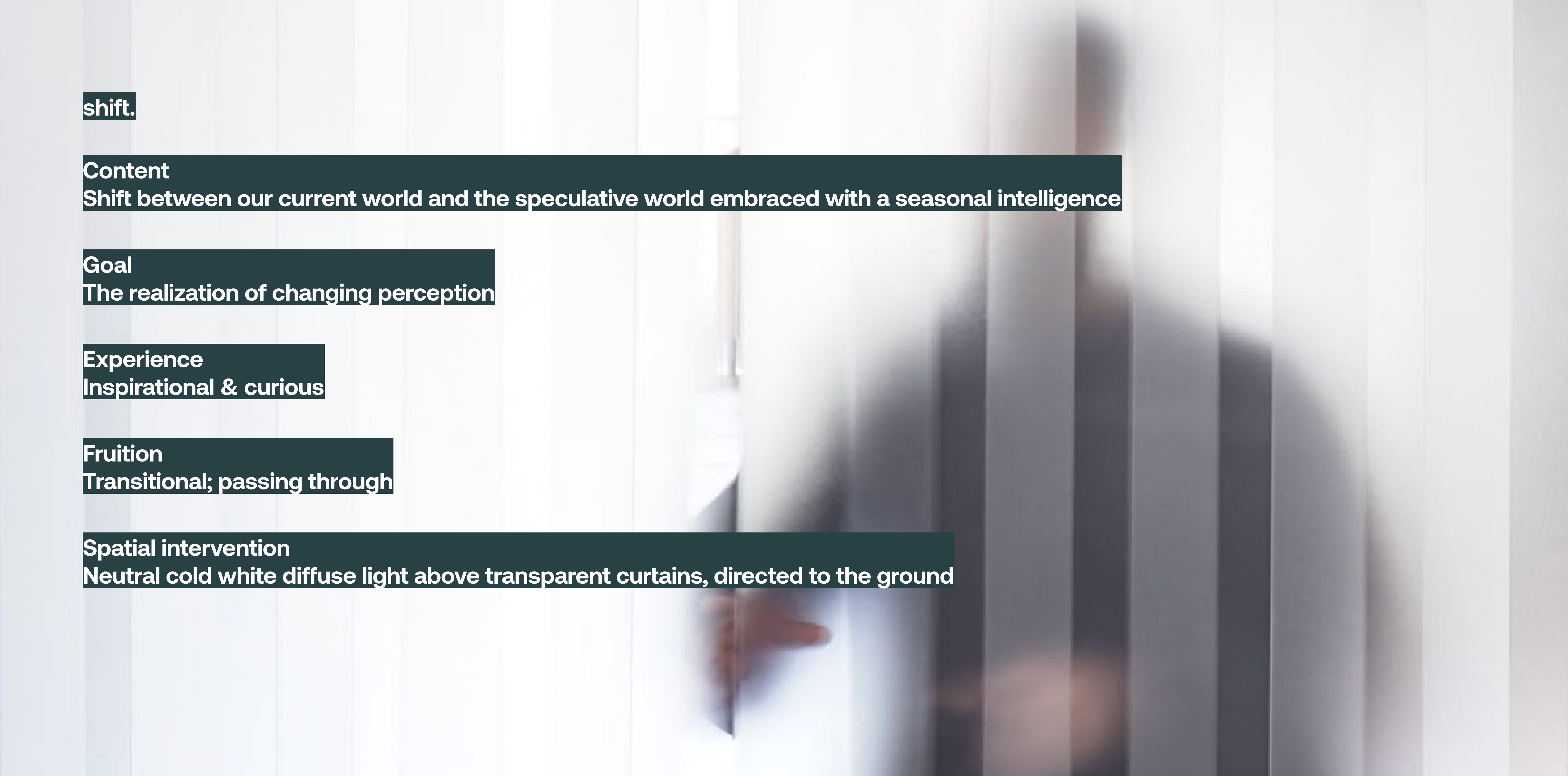 The system responds to the presence and movement of the audience, shaping the experience across different states. Interaction is not based on control, but on attunement where users influence the environment through their behavior.